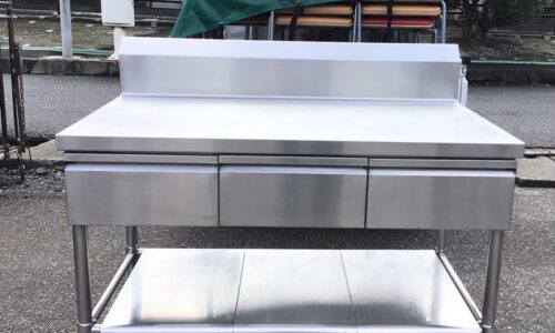 バイパス店です。程度の良い引出し付き作業台が入荷しました。サイズは幅1200x奥行き750x高さ850。表側の天板や足、引出しはSUS3…